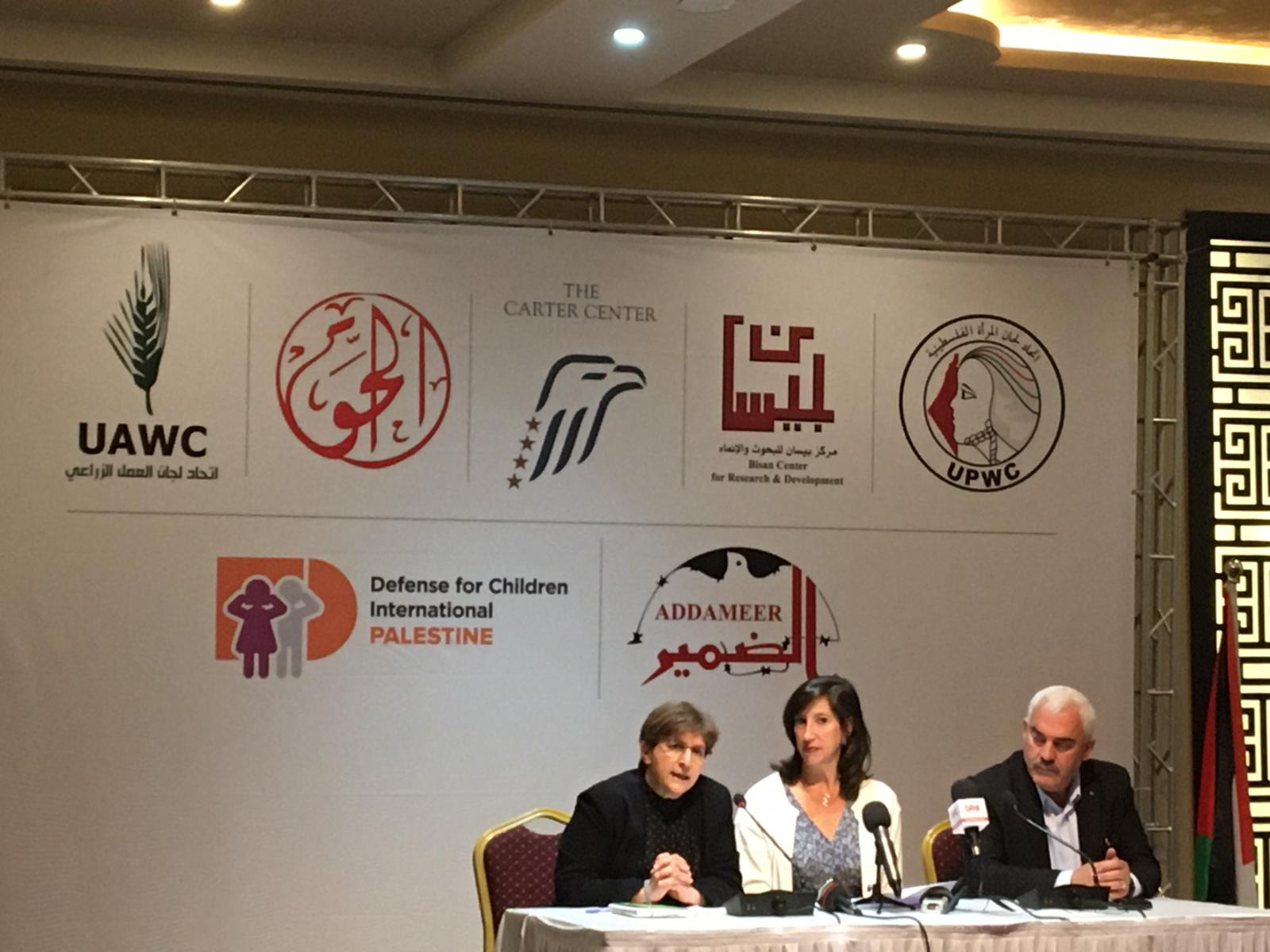 The Six prominent Palestinian civil society and human rights organizations welcomed the meeting organized by the Carter Center in Ramallah today 6 April 2022, and emphasized on its importance to show solidarity and support to civil society and human rights in Palestine. Panelists during the press conference included Ms. Paige Alexander, Chief Executive Officer of the Carter Center, Advocate Sahar Francis, the General Director of Addameer Prisoner Support and Human Rights Association, and Mr. Shawan Jabarin, the General Director of Al-Haq. Ms. Alexander highlighted the importance of civil society for the protection of human rights and stressed that Israel's acts such as the designation makes it harder for civil society to carry out their vital work, and called on the International community to continue to pressure Israel to rescind the designation against the six Palestinian organizations.